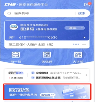 2.注册登录后,在首页点击进入“医保钱包”服务界面。(划重点:需本人手机号实名认证,否则不予通过。)