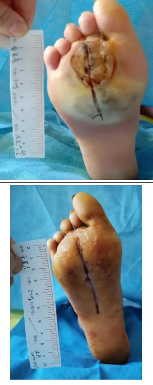 科室在马英丽主任指导下成立糖足小组(孙志斌、严益萍),专门负责患者的伤口处理,并配合其他各项综合治疗。科室从主任、护士长到所有医护人员不厌其烦,反复查房指导,主管医生赵婉及护士更是一有空对患者进行一对一的专科指导,在大家的努力下,患者长达一年之久的足部伤口逐渐愈合。