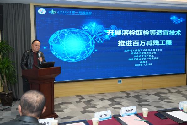 西安交通大学第一附属医院多位专家进行现场授课。韩建峰教授对《国家卒中百万减残工程2024年工作》进行总结;高毅军教授讲述《开展溶栓取栓等适宜技术推进百万减残工程》;屈秋民教授对《2023版中国脑血管病临床管理指南》进行解读。接着,市中心医院原向军对《渭南市卒中中心2024年质控工作》进行总结分析,并对2025年质控工作进行安排部署。
