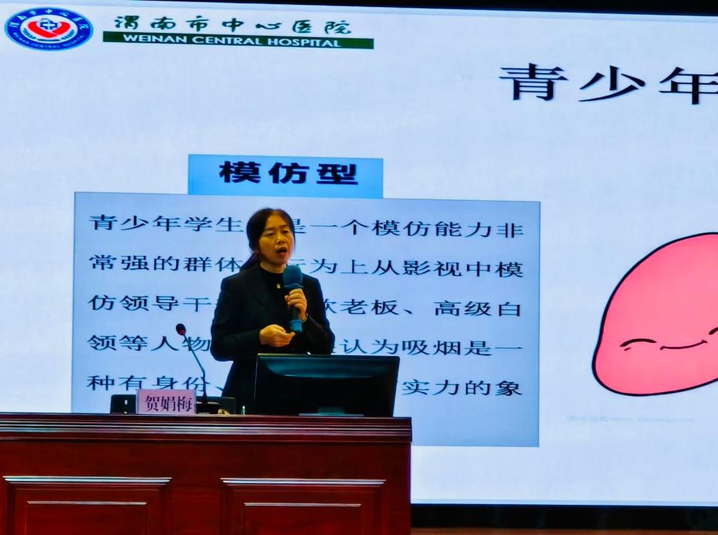 呼吸内科副主任医师贺娟梅以《拒绝烟草珍惜生命》为题,结合一系列触目惊心的数据和影像资料,生动讲解了吸烟与肺癌、慢性阻塞性肺疾病、心血管疾病等多种致命疾病之间的直接关联。她特别针对当前电子烟在年轻群体中逐渐流行的现象,进行了科学讲解与澄清。指出电子烟所产生的气溶胶中同样含有尼古丁和重金属等有害物质,并非商家所宣传的“健康戒烟替代品”,长期使用将对青少年大脑发育和呼吸系统造成不可逆的损害。