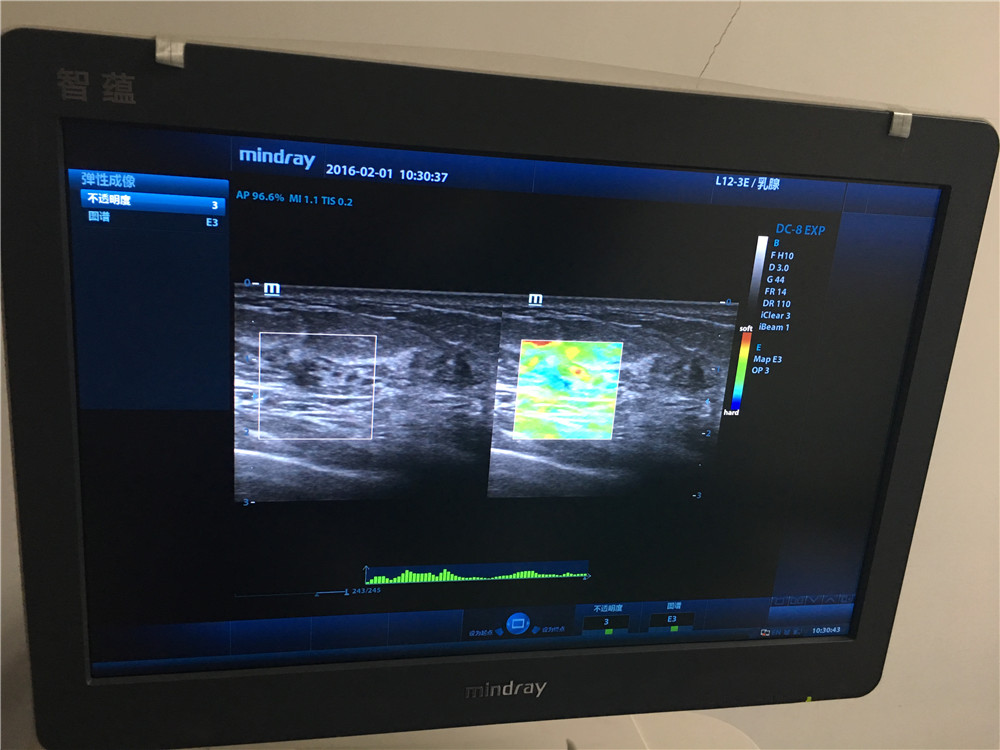 为进一步提高乳腺检查的敏感性和诊断的准确性,我院功能科在全市率先引进弹性成像这一辅助新技术,为早期诊断、鉴别乳腺肿瘤的良、恶性及早期治疗提供的一种新的有效途径。 作为一种全新的成像技术,弹性成像扩展了超声诊断理论的内涵和超声诊断范围,弥补了常规超声的不足,能更生动的显示、定位病变及鉴别病变性质,使现代超声技术更为完善。实时组织弹性成像不仅能帮助早期发现不易触及的微小及深在的病灶,在识别传统灰阶声像图上难以发现的病变浸润区域上也有优势,还能鉴别一些临床上较难诊断的乳腺病灶,如不典型的乳腺病及炎性病变。并且,如果弹性成像图与灰阶声像图上肿瘤的大小比较确可作为一种可靠的检测指标,那么临床早期发现恶性乳腺癌的比率将大大提高,需要接受活检以确定良恶性的患者数也将大大减少,既可帮助减轻社会医疗保健的经济负担,也可减轻患者自身身体和心理上的痛苦。其在临床上的应用包括:1.癌症的早期诊断;2.病变的良性、恶性判断;3.癌变扩散区域的确定;4.治疗效果的确认。