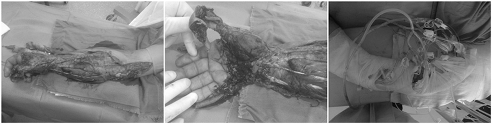 患者生命体征稳定后转至骨二科进行进一步治疗。副主任医师武东升收治患者,并立刻对伤情进行处理,在取除敷料后,可见上肢自肘上5cm以远端皮肤剥脱,直至手掌背部,肌肉组织撕裂成絮状,伤处表面有大量泥沙样异物覆盖,皮肤撕裂呈絮状。拇指表面的软组织剥脱,残余部分指骨,其余手指末梢无血运。患者的手部感觉明显减退,不能活动,肘关节、腕关节不能活动。