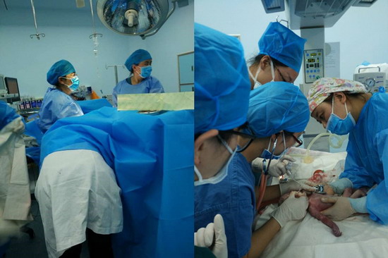 10月21日晚,产科病房如往常一样,忙碌有序。忽然,几位家属急匆匆地推着平车送来一位孕妇到护士站。值班医生、护士马上接诊,得知该孕妇由基层医院转诊而来,已下腹阵痛8小时,并且孕妇是二胎、臀位,30+6周妊娠、胎膜早破。医生在询问病史的同时立即入产房检查,只见胎儿的肢体和脐带已脱出。胎儿臀位最害怕的就是脐带脱垂,若不及时采取措施,脐带受压几分钟内就会导致胎儿窒息死亡。情况危急,必须争分夺秒,立即手术才有可能挽救胎儿性命。但产妇刚刚急诊入院,术前各项化验抽血急查,报告单不会马上出来。若要等待化验结果正常再手术,孩子肯定没救了,怎么办?产科魏满莉主任马上联系麻醉科、新生儿科开启绿色通道。与此同时,产科医生、护士积极做好术前准备。一路绿灯,不能耽搁一分钟,麻醉、产科、新生儿科所有当班人员都是一路跑着奔向手术间。产科一、二、三线医生齐上阵,魏满莉主任、王丽菊副主任、李芳医生,更有任洁宁大夫,她从产妇一入院做内诊检查时就托举上推胎儿肢体,以缓解脐带受压,争取手术时间,一直弯着腰保持这一姿势至手术中。术前,胎儿心率只有70—100次,又是30+6周早产。助产士、新生儿科医生早早做好复苏抢救准备。孩子顺利娩出,阿氏评分2分、6分、8分,很快,重度窒息儿复苏有效。复温台上,包裹好棉被,体重只有1650克的婴儿终于哭得响亮起来。看着这个粉嘟嘟的小家伙,在场所有人都不禁感慨:这真是一场极速大冒险,让人惊魂未定而心有余悸。产妇手术顺利,孩子平安得救。术后第二天,渭南电视台闻讯来到产科病房现场采访。