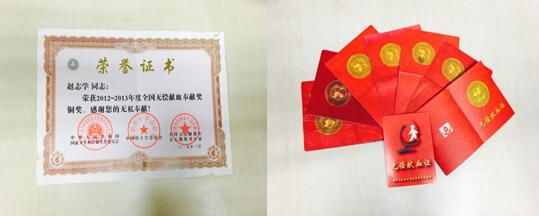 一本本献血证,一份份荣誉证书,记录了赵志学主任十多年来的爱心轨迹,他把爱撒向社会,他用热血传递人间真情。