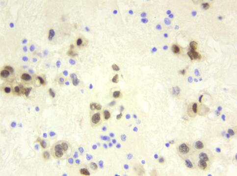 患者,女性,55岁,因腹胀不适半月余,加重乏力5天,盆腔B超提示附件包块。为了明确诊断,临床穿刺抽取500ml血性腹水做病理检查。病理科在接收到患者的腹水标本后,首先做了涂片的细胞学检查,初步提示恶性瘤细胞。在与临床大夫沟通后,科室将剩余的腹水制成了细胞蜡块,行石蜡包埋(图一)并加做了免疫细胞化学染色。免疫细胞化学结果显示Pax-8、ER、WT-1阳性(图二),同时标记间皮的指标阴性。因此,通过细胞蜡块技术该患者可明确诊断为“腺癌,卵巢来源可能性大”。随后患者进行了8次化疗,病情有所缓解,无腹胀,肿瘤系列恢复正常。
