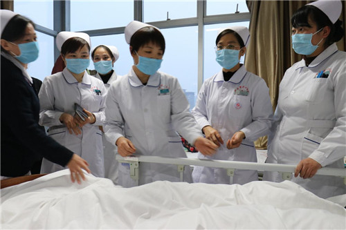 本次查房围绕一例高龄危重患者大面积脑梗死并梗死后出血的护理展开,在听取责任护士杨帆的病情汇报及到病房现场查看患者后,神经内科南江波副主任护师对该患者的肌力评定、深静脉血栓的预防、语言及吞咽的康复护理、良肢位的摆放等进行讲解和指导;神经内科康复护士张丽娟现场演示为患者进行被动康复锻炼的手法、姿势等动作要领;呼吸内科孙洁玉副主任护师分析了患者痰液不易吸出的原因,并指导护士放置口咽管后可有效吸痰,同时也提出给患者适度雾化、加强口腔护理、抬高床头等护理措施;皮肤管理小组伤口造口师张少青副主任护师对目前该患者由于带状疱疹造成的多处大面积皮肤破溃的换药、护理做了详细的指导和安排,并提出患者是压疮的高危人群,要积极采取防范措施,还提醒护士注意胃管、尿管、吸氧管、电极片等器械性皮肤损伤的检查和预防;营养师权亚玲了解到患者目前鼻饲饮食为自制匀浆膳后,讲解了鼻胃管与鼻肠管的应用及给食方法,指导护士如何观察和预防鼻饲并发症,进一步询问了患者的身高、体重,计算出患者所需热量和营养,为患者“量身”制定了食谱;高亚梅副主任检查了护士心电监测仪的使用、口服药护理、鼻饲及各种风险防范健康教育情况,对危重患者的管理及多种并发症的预防、优质护理方面提出指导性意见。