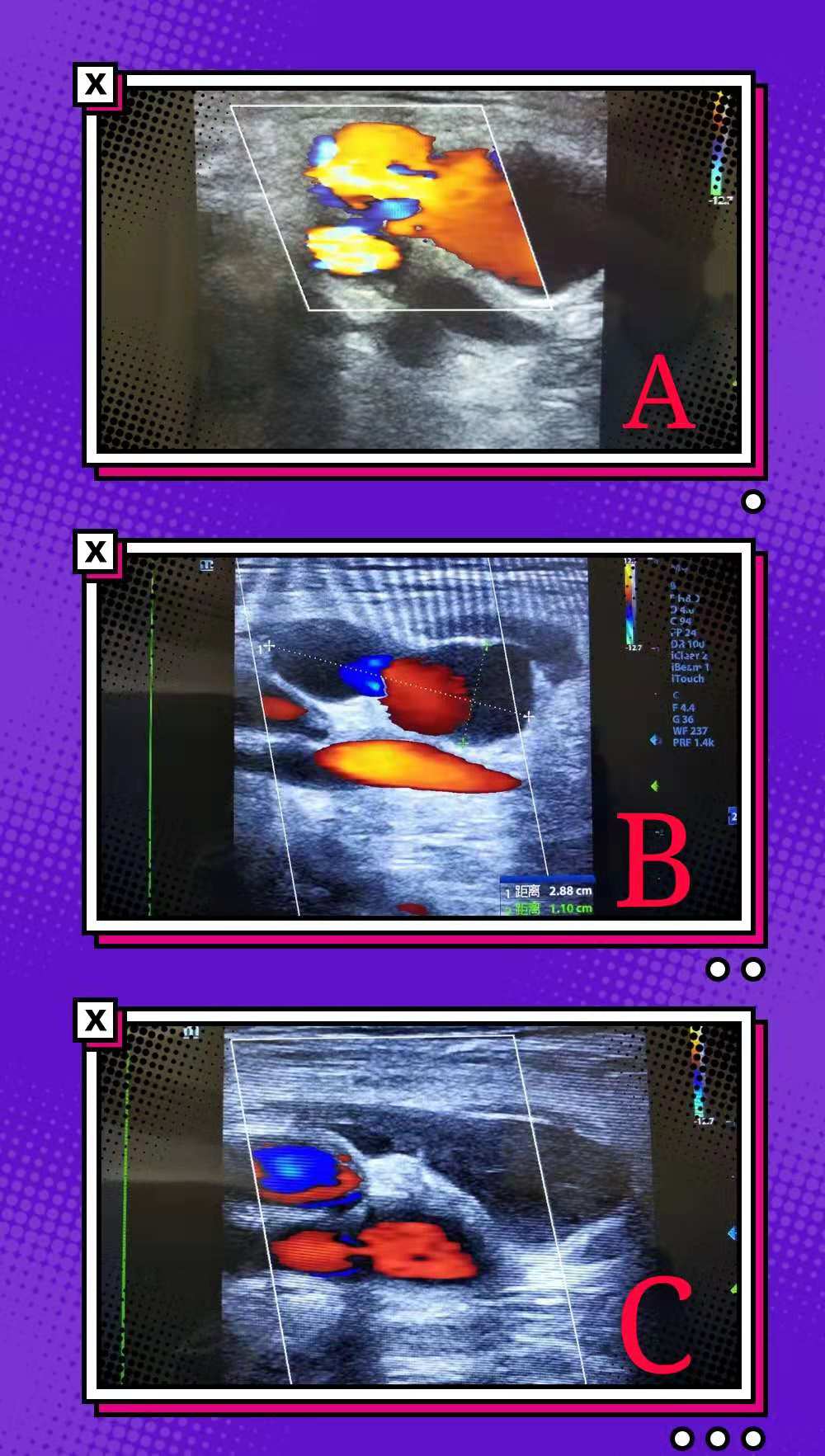 患者李女士, 因双侧下肢动脉血栓病,在中心医院神经内科进行血管扩张术,在术后出现双侧股总动脉假性动脉瘤,经过1天的局部加压包扎后仍未好转,经神经内科医师联合超声科的刘晓晖主任医师、韩婷婷医师商讨后决定为患者行超声引导下经皮假性动脉瘤凝血酶注射治疗术。术中耗费时间仅仅为10分钟。治疗完毕后局部压迫12小时后复查已经完全漏口已经完全闭塞,且患者术前术后生命体征平稳。