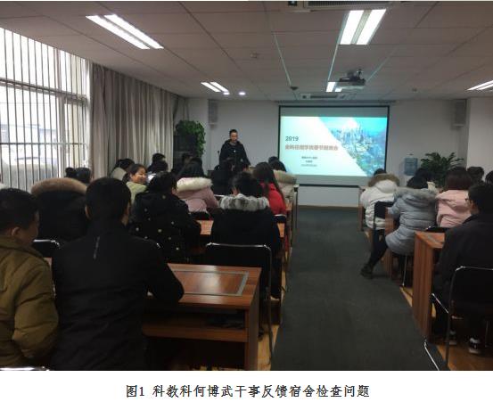 首先,科教科何博武干事反馈了近期学员宿舍环境卫生及安全用电方面存在的问题。自2018年11月份以来,科教科对学员宿舍进行了6次专项检查,对宿舍卫生较差、违规存放纸箱、违规使用大功率电器、未及时关闭插线板、充电器、空调等累计30名学员进行了通报批评和经济处罚。鉴于学员宿舍物品较多,摆放混乱,医院专门为学员宿舍配置储物柜,总务科电工班协助为每个床单元安装固定了可自控断电的插线板,通过改进,有效地解决了宿舍安全隐患。