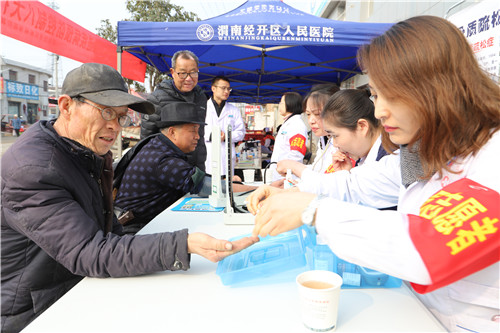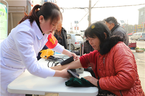 骨二科护士长连丽萍、护师王盼燕和儿保科护师党莹给前来咨询的居民们量血压、血糖、发放健康宣教手册,并告诉他们有病要及时治疗,预防疾病产生更重要。