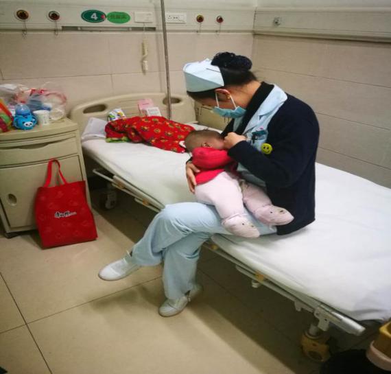 看到此情此景,科室正在哺乳期的护士武红英主动将婴儿抱入怀中进行安抚,然而婴儿仍哭闹不止,身为母亲的她由此情景联想到自己的孩子,对这个小婴儿的恋爱之情溢于言表。于是,她默默的将围帘拉上,抱起婴儿,给婴儿喂奶,哺乳期护士尚晓丽也闻讯赶到,看到小婴儿惹人怜爱的模样,又问婴儿的奶奶:“够不够,不够我这还有!”一旁的奶奶看到这一幕感动的流下了眼泪,连声说道:“这姑娘真好,这姑娘心真好!”患儿终于停止了哭闹。
