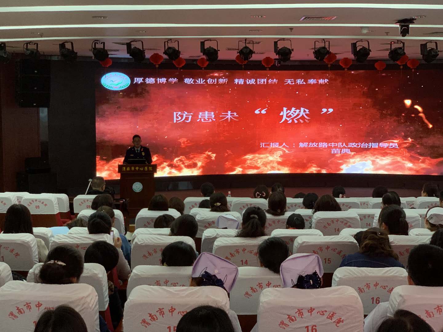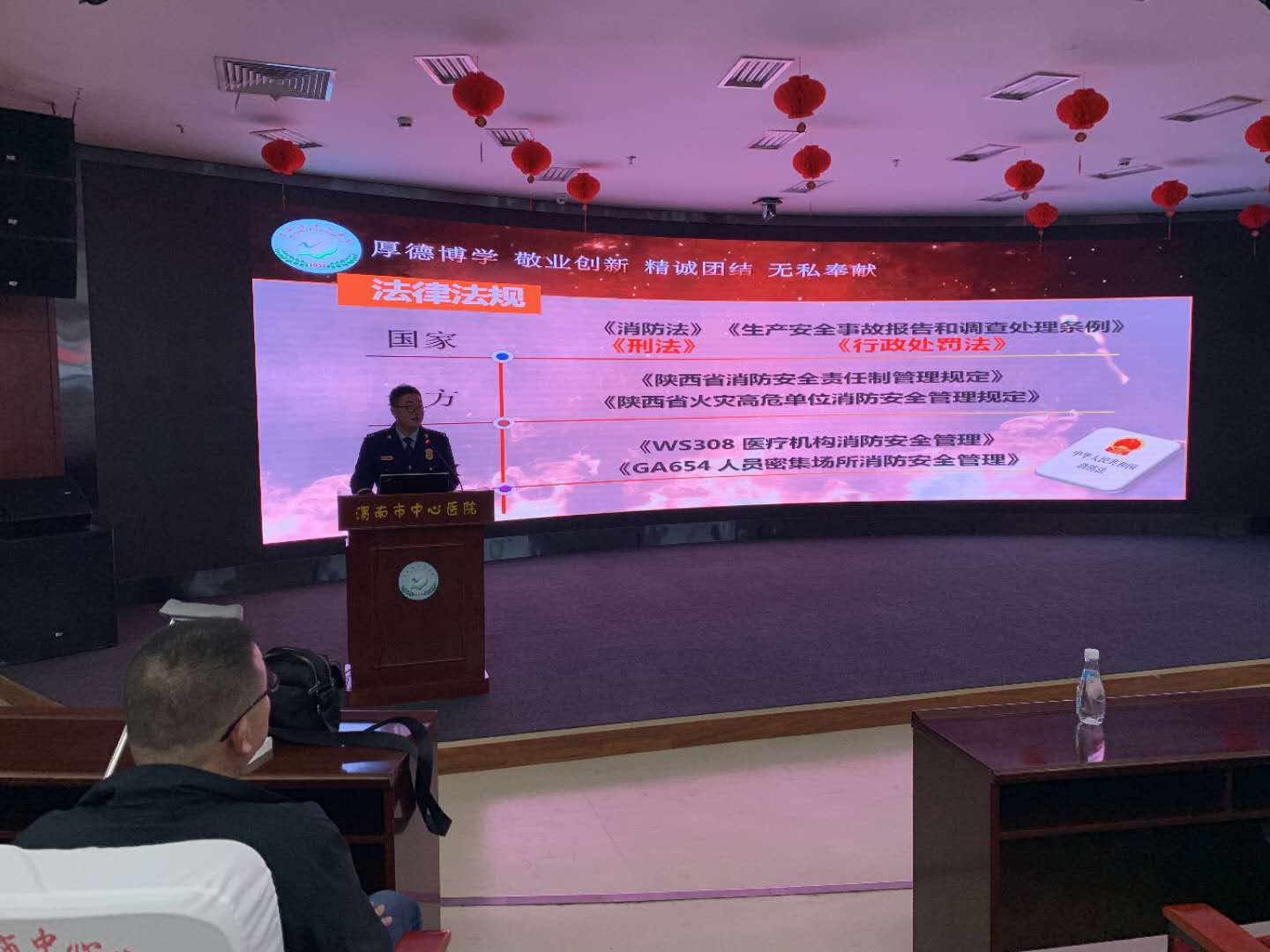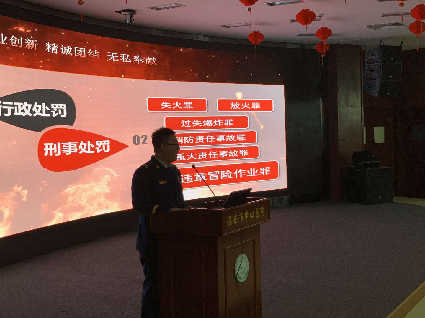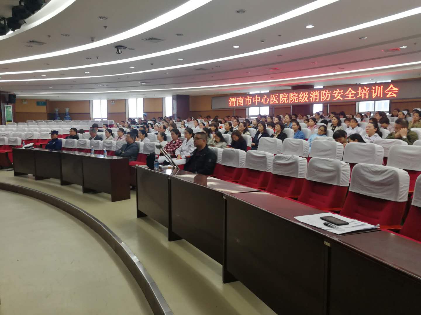 2019年火灾形势依然严峻。3月21江苏响水发生爆炸、3月31日江苏昆山发生爆炸、3月30日四川凉山发生森林大火等等,不断提示着火灾防控工作的重要性。同时根据《消防法》第十七条、《机关、团体、企业、事业单位消防安全管理规定》第十八条、第三十六条对消防安全培训的要求,以及《消防安全责任制实施办法》第四条“安全自查、隐患自除、责任自负”的要求,医院与消防主管部门积极沟通,邀请渭南市消防支队解放路中队苗典政治指导员进行消防安全培训。