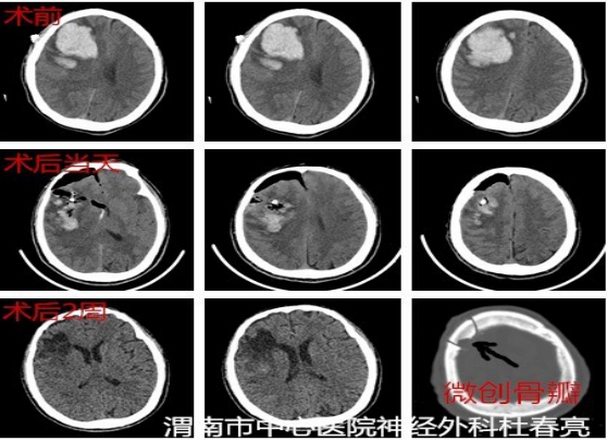 入院后,在白西民主任、姚胜副主任组织下,党俊涛主任医师及冯毅副主任医师协作,由杜春亮主治医师、王小峰医师及王举医师实施手术。避开重要的血管和神经,取右额平行于中线纵形切口长约4cm,骨窗直径2.5cm,经额叶顺穿刺将套筒准确置入患者大脑深部的血肿腔,建立供内镜通过的微小孔道,再置入圆珠笔芯粗细内镜,以提供良好的照明和视野,很快就准确彻底地清除了深藏脑内的淤血。术后CT显示血肿清除干净,目前患者神志清楚,已康复出院。
