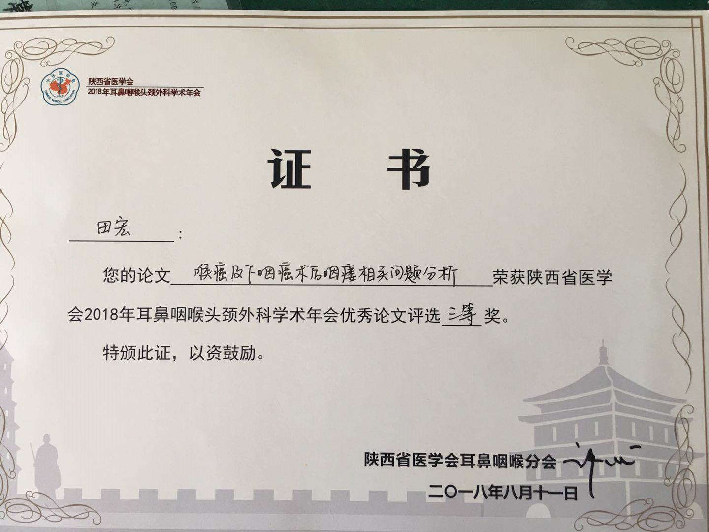 通过学习,2018年先后在耳鼻喉年会上由副主任田宏分享论文题为《喉癌及下咽癌术后咽瘘相关问题分析》荣获陕西省医学会耳鼻咽喉分会优秀论文三等奖。护理方面发表论文8篇,其中《甲状旁腺腺瘤围手术期护理》被大会录用。近日,科室集中动员,郑建军主任希望医护人员充分展现科室在渭南市耳鼻咽喉头颈外科领域的主导作用,鼓励大家撰写论文投稿,目前医护人员发表论文共计13篇。