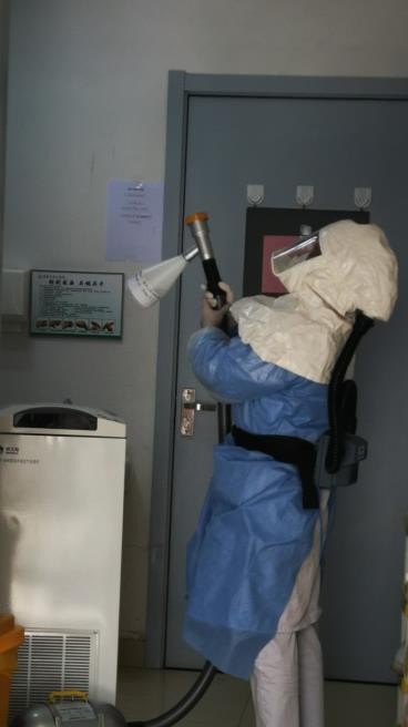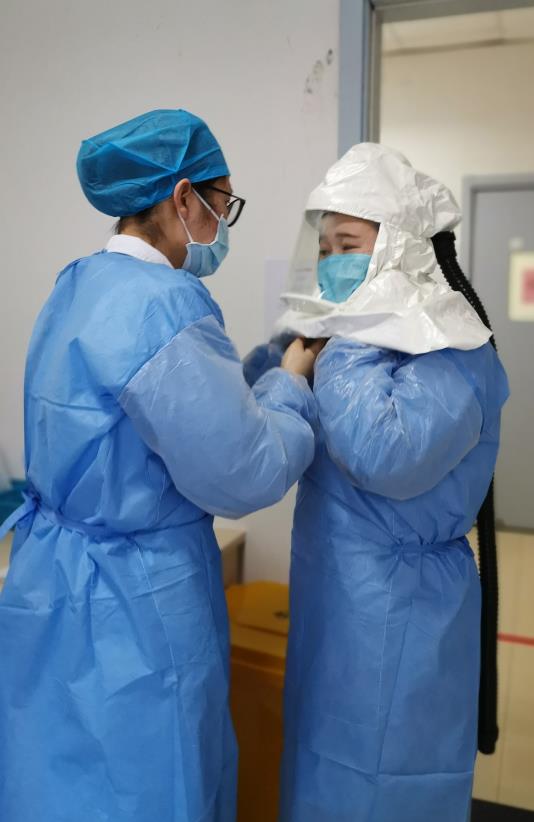 下午4点,陆续有接班的人来。“咦,姐,你怎么在这?” “我是领导派来陪你们的,同时看你们有没有严格消毒处理哦。”我笑着说到。“来,我帮你系带子,衣服全遮盖住,防护帽消毒好了,我帮你打开电源,鞋套破了,赶紧再套一个......”就这样我上岗了。