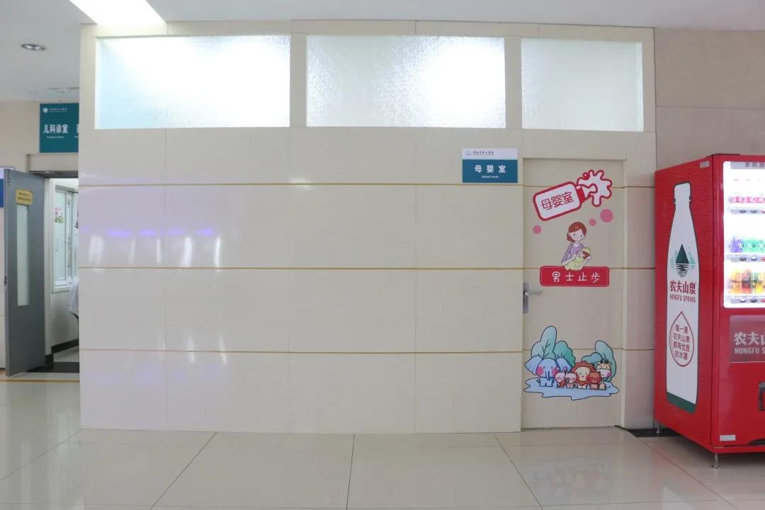 顺着大厅一楼往西走,就来到设在儿科门诊的母婴室了。门上挂着醒目的温馨母婴室标识,推门进入后发现这里的设施一应俱全,有安全实用的护理台、饮水机、衣架、便于哺乳的沙发座椅、速干手消毒剂、垃圾桶等。墙上张贴的可爱卡通贴画和亲子图片也相互呼应,整体给人十分温馨祥和的感觉。