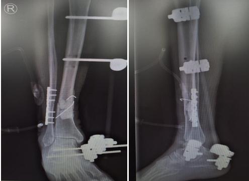 患者吴某,男性,74岁,因外伤致右胫腓骨开放粉碎骨折,右胫骨部分骨缺损7周入住市中心医院骨二科。入院诊断:右胫骨骨折骨水泥占位术后;右胫骨骨折外固定架固定术后;右腓骨骨折术后。急诊行胫骨开放骨折清创复位克氏针内固定+骨水泥占位+外固定架固定、腓骨骨折切开复位内固定、创面负压吸引术,术后定期伤口换药,预防感染等治疗。近日,在腰硬联合麻醉下行右胫骨骨水泥取除、骨折切开复位内固定、髂骨取骨植骨术,术中取部分软组织行冰冻病理切片,以高倍视野下中性粒细胞计数少于5个为标准排除感染,骨缺损处植入自体松质骨及人工骨混合物,缝合诱导膜;胫前部分切开置入内固定,术后患者伤口愈合良好。