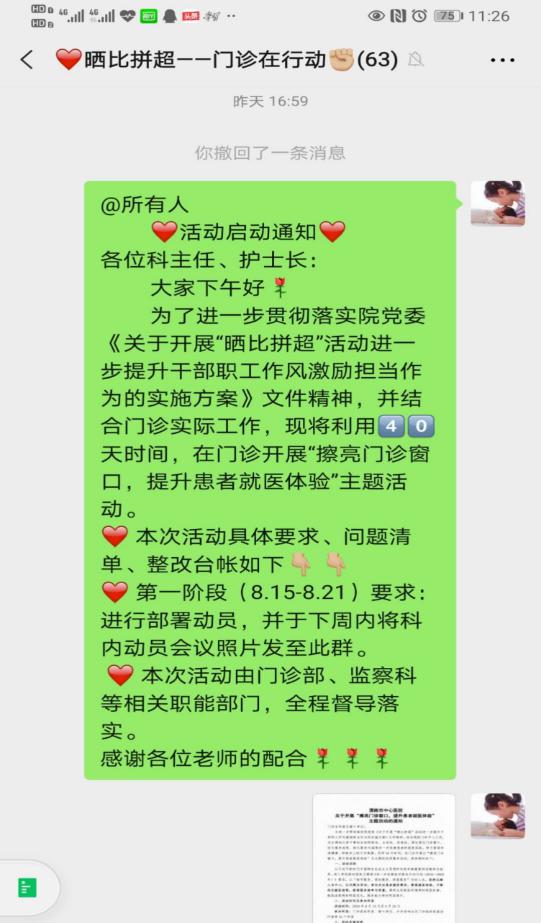 8月13日,在黄慧玲副院长周密部署安排下,门诊部牵头制定了《关于开展“擦亮门诊窗口,提升患者就医体验”主题活动通知》,并建立了“晒比拼超·门诊在行动”微信专项群,将文件发至群内后,迅速进行部署安排,督导落实。至此,门诊部“擦亮门诊窗口,提升患者就医体验”主题活动拉开序幕。