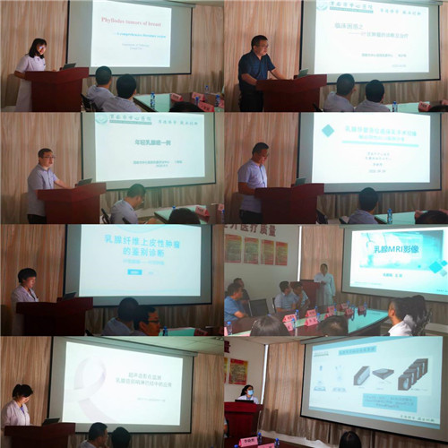 病例讨论环节由乳腺中心李晓辉,宋少伟和卜智斌三位副主任医师分别以《乳腺导管原位癌保乳手术切缘》《叶状肿瘤的诊断及治疗》和《新辅助化疗后手术若干问题》为题进行病例汇报,并提出诊断及治疗上的困惑。病理科崔旭主治医师的《乳腺纤维上皮性肿瘤的鉴别诊断》对一些临床困惑做了解答。病理科尹香利主任以《Phyllodes tumors of breast—A comprehensive literature review》全英文的文献综述讲解了国外最新叶状肿瘤的病理诊断,以及手术切缘等临床医生关切的相关问题。MDT团队成员讨论发言踊跃,气氛热烈。