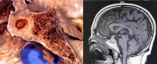 蝶窦位于蝶骨体内,左右各一,均各通过其前壁的孔开口于蝶筛隐窝,通常分三型:甲介型(3%)气化及发展比较差;鞍前型(11%)气化与发育好于甲介型,但不及鞍型;鞍型(86%)气化及发育最好。甲介型蝶窦是指蝶窦发育不良、气化程度差,其后壁与鞍前壁间骨质达10mm者。虽蝶窦腔内由松质骨充满,但由于解剖标志不清,鞍底定位困难,过去多数学者认为经蝶入路的禁忌证,必须改用经额入路开颅手术。
