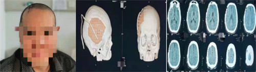 图3.术后外貌,术后颅骨CT平扫及颅骨CT三维成像