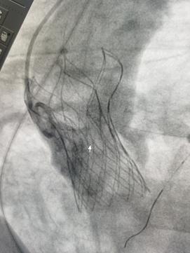 手术当天,心内科团队预先放置左冠导丝,进而左冠脉开口可以不受任何影响。在各专业团队的合作下,患者TAVR手术顺利完成。整个过程患者生命体征平稳,经术中食道超声检查提示,人工瓣膜功能良好,解决了主动脉瓣重度狭窄问题,冠脉血流通畅,手术取得圆满成功。术后第一天,患者由重症监护病房转回普通病房。
