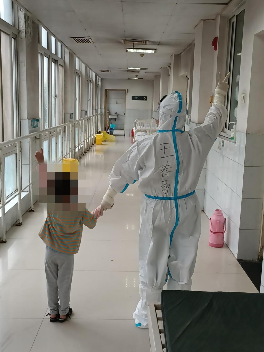 在这里总会收获小小感动。一天下午,我所照顾的一名小患者,在家人做CT、一个人独守病房时突然大哭起来。看着孩子委屈的眼神,我非常心疼。一只手紧握着孩子的手,另一只手为她擦掉泪水,“别哭,不要怕,阿姨在这里陪你一会好吗?”一开始她还有点抗拒,在我给她讲故事、陪她说话的过程中,孩子慢慢适应了。不一会儿,我们就成了朋友。我带她在楼道里玩了一会,她开心起来,我感到非常欣慰。虽然这里是隔离病房,但隔离不隔爱。我们对待这里的每一位患者就像对待自己的亲人一样,用爱守护,为他们点亮一盏温暖的心灯。