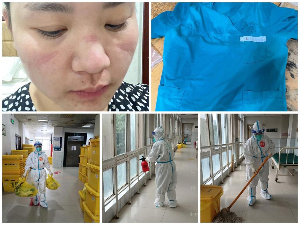 隔离病房里的每一个工作细节都是严谨的,容不得一丝差池,所以在这里的每一分每一秒都是紧张有序的。除了常规的护理、及生活照顾之外,最重要的是环境消杀及垃圾处理。走廊、办公区域、病房等均按照院感要求,高标准严格消毒。病人出院后,我们会对病房进行终末消毒处理,床单位消毒、紫外线消毒,有效氯喷洒,被褥处理,垃圾处理,大量的消毒工作加上厚重的防护装备,每次脱下防护服,都能够看到被汗水湿透的衣服、被口罩压红的面颊、被汗水浸泡发白的双手,但从来没有人抱怨、退缩过,大家相互加油、打气,用实际行动诠释着责任担当。