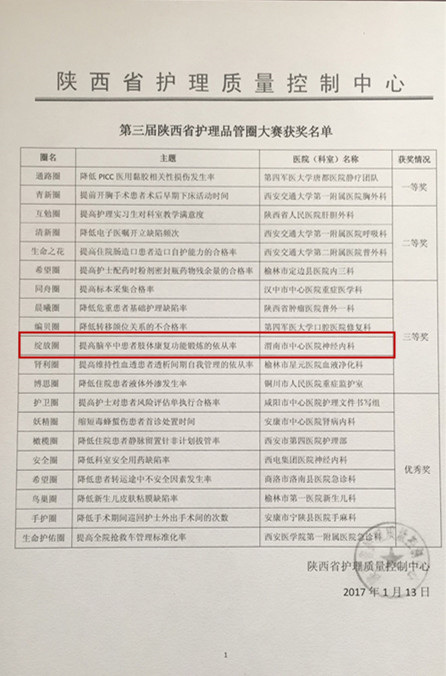 1月13日,由陕西省护理质控中心主办的陕西省第三届护理品管圈成果展示活动在西安举办,总计20个品管圈成果进行了现场展示。这20个品管圈成果是从各地、市二级质控中心上报的129个品管圈中,经过省上专家初评脱颖而出的。我院神经内科的“绽放圈”是我市唯一一家进入大会交流的品管圈成果,护士付洋和陈蒙代表圈组进行了现场展示,荣获三等奖。