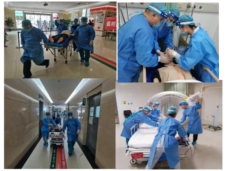在培训同时,为巩固并强化新冠肺炎防控期间危重伴发热患者救治流程临床规范应用,院前、院内、预检分诊口分组进行多次演练,梳理流程,为联合演练做好准备。