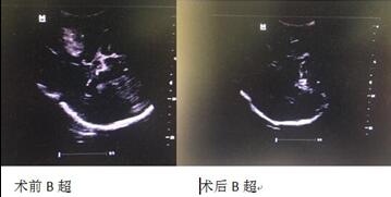 在周东升主任医师现场指导和超声诊断室医师的密切配合下,由姚胜副主任、吕智龙医生主刀完成了我市首例术中超声导航脑内出血清除手术。术中在B超引导下,迅速准确地确定了血肿部位,最大限度保留了正常脑组织功能,达到了完全清除血肿的目的,取得了良好的 手术效果,减少了手术的副损伤。在出血清除后,由麻醉师对患者实施30秒正压通气后,再次行B超探测检查,了解是否存在再出血,并可清楚地显示血肿清除后脑搏动情况和中线结构移位恢复程度,判断视线死角无血肿残留。手术顺利,术后恢复良好,无偏瘫、抽搐等神经功能障碍。家属对手术效果非常满意。