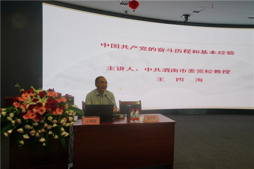 授课中,王四海教授从中国共产党的建立、中国共产党的奋斗历程、中国共产党的基本经验等三个方面进行了深入浅出、风趣幽默的讲解,重点从“开天辟地、艰苦探索、改革开放、基本经验”四个方面系统阐述了99年来一代又一代中国共产党人无私奉献、顽强奋斗,领导中国从弱小走向强大,从苦难走向辉煌的历史进程,为我们彰显了一个理想信念坚定的党,一个实事求是、与时俱进的党,一个立党为公、执政为民的党。最后,王教授用“六色”勉励大家,希望大家传承红色,坚定理想信念;锻造底色,对党绝对忠诚;牢记角色,恪守人民情怀;永葆本色,承担历史重任;探索特色,走出新的路子;干得出色,争创一流佳绩。
