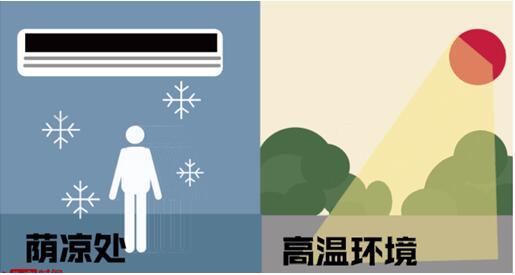 休息环境:高温天气,室内外的温差不宜过大,以不超过5℃为好。室内温度不低于25℃。开空调的房间不要长期关闭,要经常通风。入睡后,最好关上空调。当在室内感觉凉意时,一定要站起来活动四肢和躯体,以加速血液循环。患有冠心病、高血压、动脉硬化等慢性疾病的病人,尤其是老年人和关节痛患者,不要长期呆在冷气环境里。