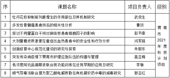 根据2021年渭南市科技计划项目评选要求,我院聘请西安交通大学科研专家对我院拟申报的21项科研项目进行了综合评估和现场答辩。现将拟立项项目排名公布如下: