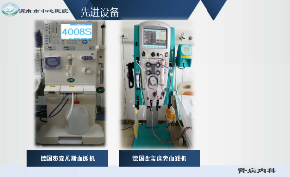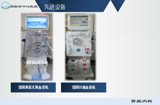 病区目前开放床位24张,血透中心设置40个透析单元,我科是一个仪器设备先进的现代化临床科室,病区配备了全数字超声诊断仪、全自动活检枪、空气波压力循环治疗仪、心电图机等。透析室配备了血液透析机32台,血滤机8台,远红外线内瘘治疗仪2台,结肠透析机1台,CRRT机1台,床单元消毒机1个及多参数监护仪、输液泵、推注泵等。