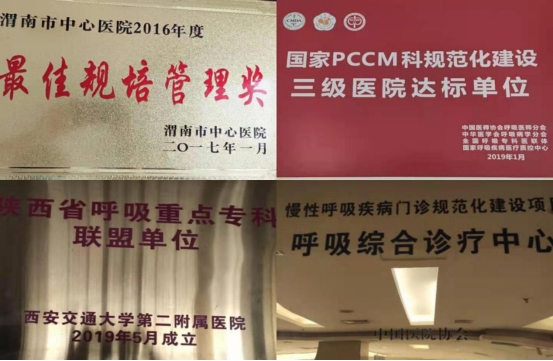 呼吸与危重症医学科系渭南东部唯一一家集医疗、教学、科研为一体的综合型呼吸疾病诊疗科室,设置床位52张,设置有普通病区、RICU、支气管镜室、呼吸实验室等,拥有日本olympus支气管镜、内科胸腔镜、超声支气管镜、呼吸机、肺功能检查仪、呼出气NO监测仪、全导心电图机、睡眠监测仪、多台监护仪等先进医疗设备。自2008年成立渭南市呼吸分会以来,成功举办了渭南地区呼吸年会、承办陕西省肺功能培训、慢阻肺培训项目及省级继续医学教育项目。2008年被确认为市级优势专科,2019年通过国家PCCM认证合格单位。
