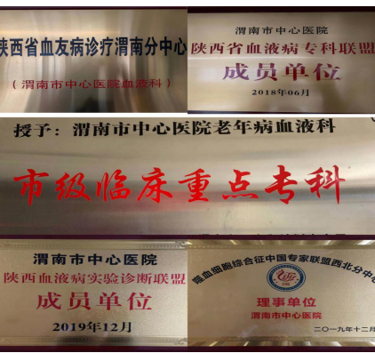 乐鱼手机站入口血液病科成立于1998年,是我市唯一集医疗、教学、科研为一体治疗血液病的专业性科室,是渭南市临床重点专科,陕西省血液病专科联盟成员单位,陕西省血友病诊疗渭南分中心,嗜血细胞综合征中国专家联盟西北分中心理事单位。科室开放床位40张,其中无菌病床4张。科室现有医务人员30名,医生9人,护士19人,技师2人,其中高级职称8人,中级职称8人,所有副主任医师均参与住院医师规范化培训师资培训,获得师资证书。科室下设血液科病区、血液科门诊、血液病实验室等,是一支结构合理的医疗、科研高素质团队。