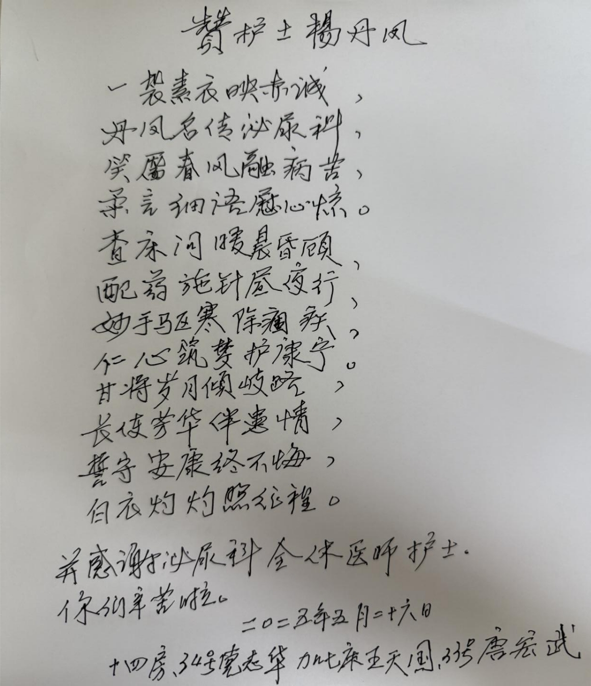 这封表扬信,于她而言,是荣誉,更是鞭策。让她更加深刻地明白,自己的每一个举动、每一句言语,都可能在患者心中留下深刻的印记。在未来的日子里,她将继续怀揣着这份赤诚之心,在泌尿外科这片小小的天地里,用爱与责任书写更多温暖的故事。她愿如那信中所赞美的那般,以一袭白衣,守护每一位患者的安康,在岁月的长河中,让生命之光在她的守护下熠熠生辉。