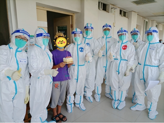 轩轩的父母常年在外地务工,因为年纪尚小又是独自1人入住隔离病区心中难免会有恐惧,曹蕙和她的战友们对轩轩百般照顾,得知9月5日是他的生日,医护人员为轩轩举办了仪式感满满的生日会,尽管缺少家人的陪伴,来自“大白”的祝福与关爱给小轩轩留下了深刻的印象。