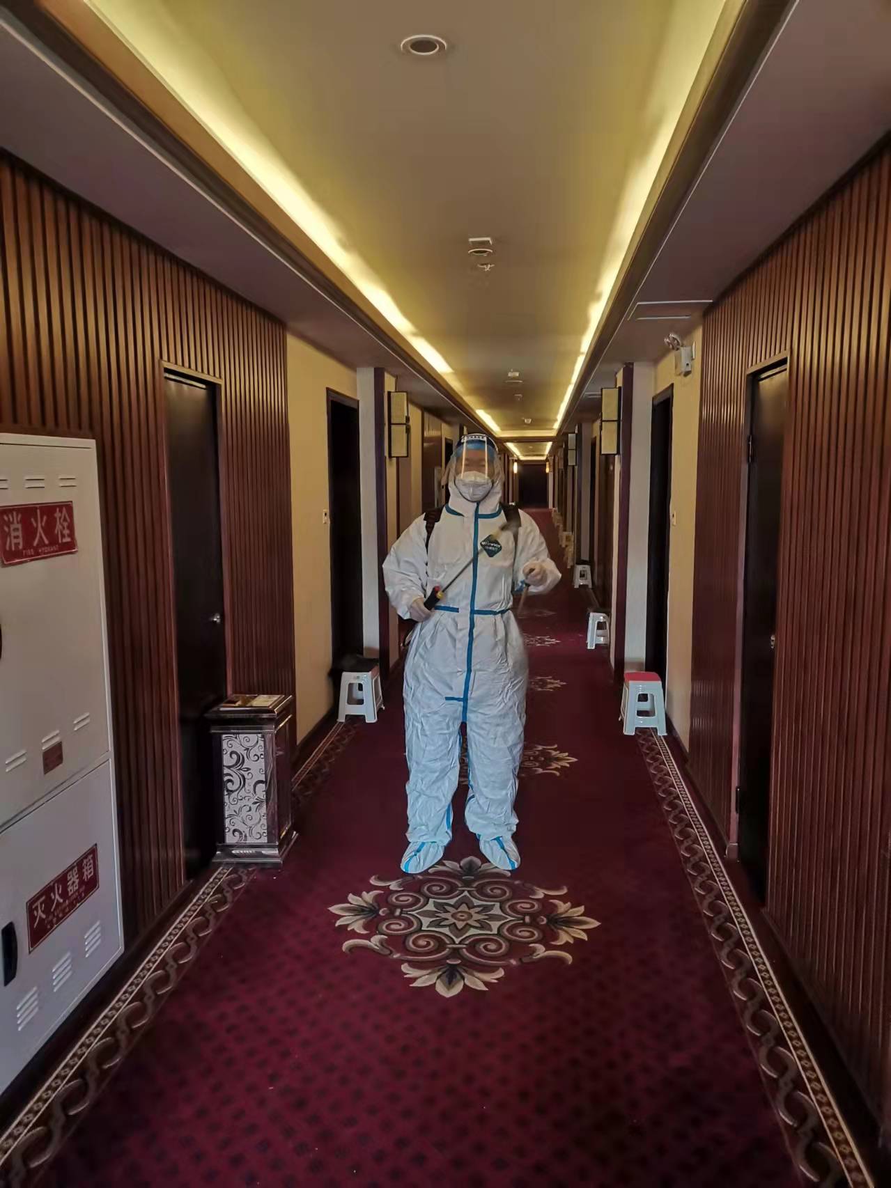 在古格专班工作期间,总能看到李宪军忙绿的身影穿梭于酒店各个区域,因来阿里时间短,还未适应高寒缺氧环境,一场工作下来,李宪军累得气喘吁吁。有时为了消杀彻底,他不得不加大剂量,较高的浓度又常常让他双眼红肿,呼吸困难,连正常说话都觉得困难。酒店服务员防控意识较薄弱,李宪军也会全程指导他们更换床单被罩、清扫等工作,60多间的隔离房处理结束,经常会忙到凌晨1、2点。