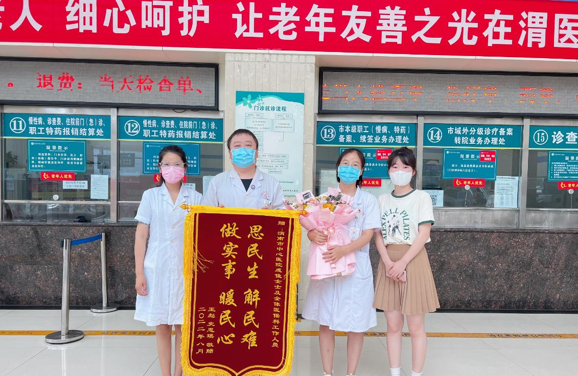 8月15日上午,患者家属带着一面写着“做实事 暖民心 思民生 解民难”的锦旗送到市中心医院医保科窗口,对医保科工作人员表达真挚的谢意。