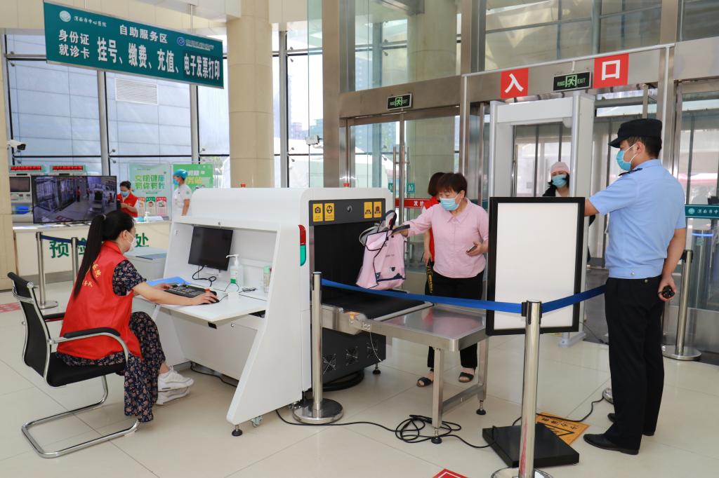 安检通道配备的安检设备有金属探测门、微剂量X射线行李检查设备、手持金属探测仪,具备智能违禁品探测、人体测温、人流量计算及违禁品智能识别和声光报警等功能。医院在主要出入口筑起安全防线,工作人员对进入医院人员及携带物品进行安检。自6月10日试运行的5天时间里,共安检人数13000余人,查获禁止、限制携带物品6个,其中还有各类刀具。同时,工作人员对携带违禁物品的人员进行安全教育。