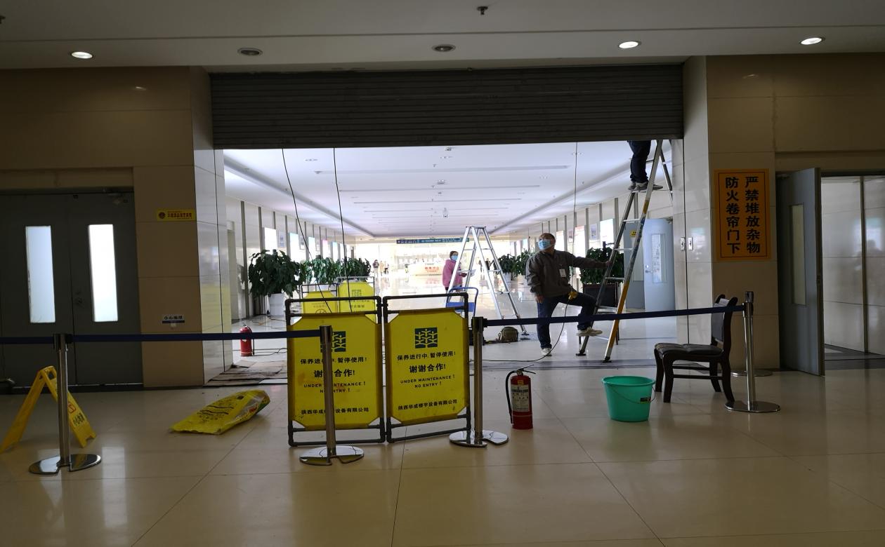 检查组随即来到住院一部一楼的防火卷帘门处时,卷帘门突发脱落,保卫科第一时间在防火卷帘门处张贴警示标语疏导过往人员。为防止已脱落的防火卷帘门脱落范围继续扩大,保卫科组织人员对院内其他防火卷帘进行排查,周末全员上岗配合第三方专业公司对故障防火卷帘门进行维修保养,有效保障了医院的安全环境。