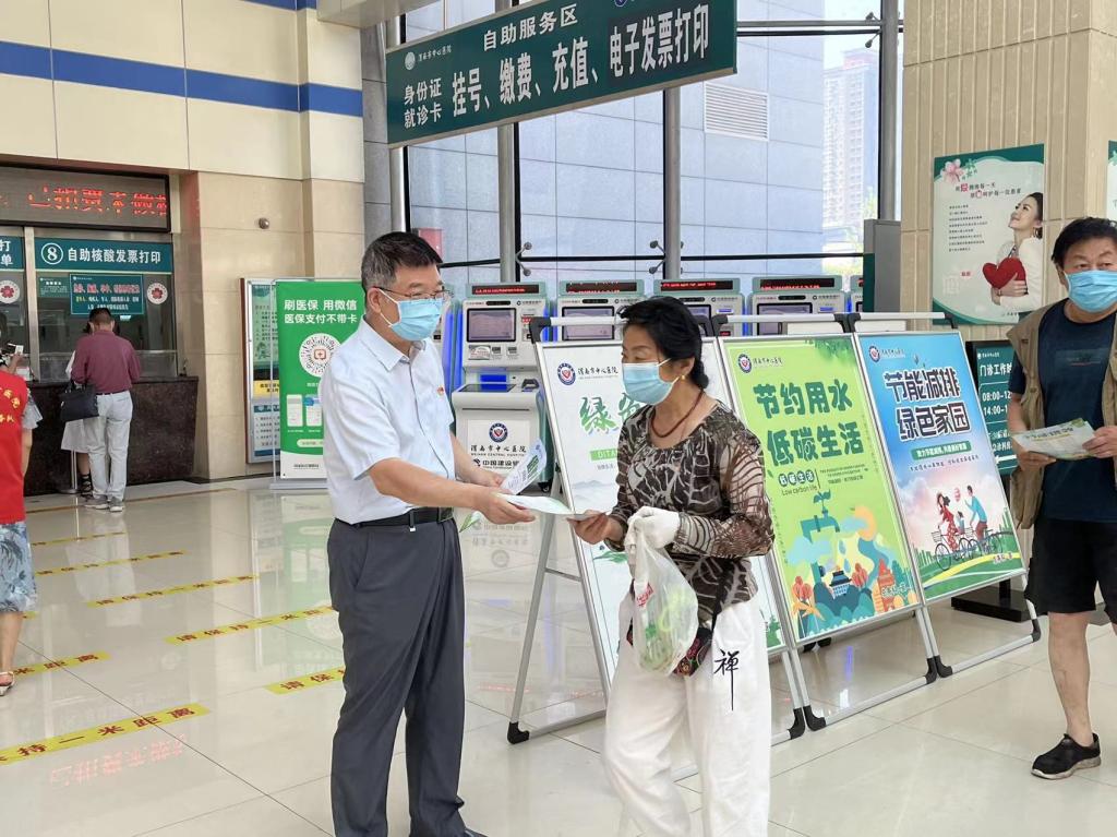 宣传活动现场,后勤主管领导张亚峰带领工作人员通过在门诊大厅摆放节能宣传展板,发放宣传彩页等方式进行宣教,宣传节能降碳和绿色发展理念,倡导践行绿色低碳生活方式。同时,在门诊大厅LED屏投放节能宣传片,重点宣传节约用水行为规范,在医院公共区域、宣传栏等患者和医务人员来往各处张贴节约小标识、增放节能降耗宣传单。