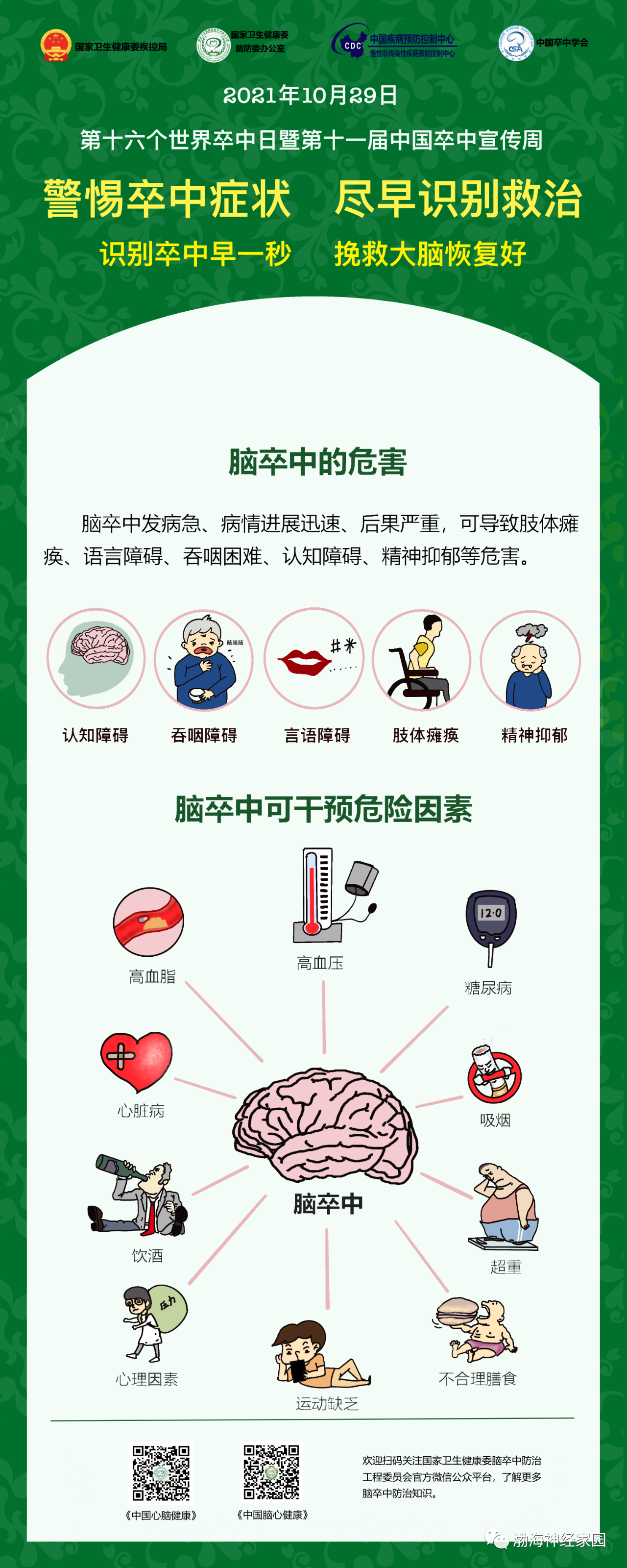 2021年10月29日是第16个“世界卒中日”。为贯彻落实《健康中国行动(2019-2030年)》《国家卫生健康委疾控局关于开展2021年慢性病系列宣传活动的通知》等文件精神,有效预防和控制脑卒中高危因素,提高群众卒中识别能力,减少因脑卒中导致的残疾、死亡发生,按照国家卫生健康委脑卒中防治工程决定组织开展“2021年世界卒中日暨第11届全国卒中宣传周系列活动”。