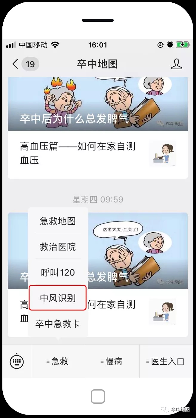 通过关注微信“卒中地图”公众号,可详细了解卒中防治和急救知识,明确获知身边具备卒中救治能力的医疗机构的具体位置和联系方式等信息。