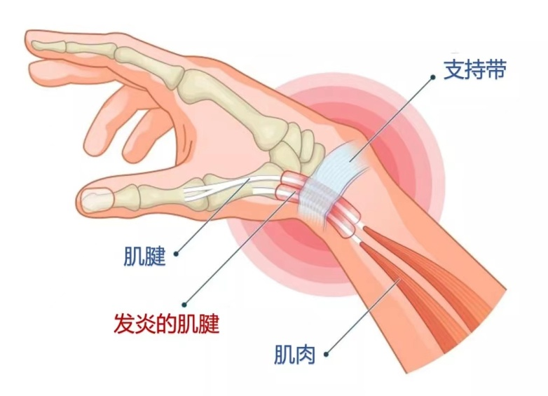 桡骨茎突狭窄性腱鞘炎俗称“妈妈手”,主要是因为拇长展肌和拇短伸肌这两个肌肉的腱鞘发炎,肌腱肿胀受压,腱鞘张力增加,从而导致局部疼痛,严重时会产生黏连并最终导致活动受限。临床上常常表现为手腕位置的疼痛。主要症状是大拇指近手腕处出现持续疼痛及肿胀,甚至无法用力。
