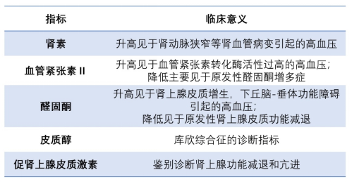 高血压五项检测指通过检测肾素-血管紧张素-醛固酮系统(Renin-Angiotensin-Aldosterone System,RAAS)中的肾素、血管紧张素Ⅱ、醛固酮,以及下丘脑-垂体-肾上腺皮质(Hypothalamic-Pituitary-Adrenal,HPA)轴中的皮质醇和促肾上腺皮质激素,已经成为原发性高血压和继发性高血压分型诊断、治疗的重要指标。判断出高血压的类型,有利于临床医生做针对性治疗。具体临床意义如下:
