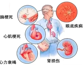 高血压的病变特点为全身细小动脉的硬化,通常累及心脏、脑血管、肾脏、眼底等多个重要器官。可引起脑梗死、脑出血、冠心病、肾功能不全、眼底病变等多种并发症。
